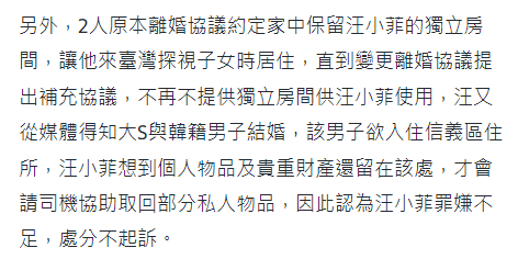 汪小菲这次出庭,台媒又拿到内幕,正本两东谈主别离后商定在家中保留汪小菲的舒服房间,让他到台湾后住在家中探访子女,大S与具俊晔授室之前条件补充别离契约,取消了汪小菲的舒服房间,还条件前夫不得踏入豪宅。