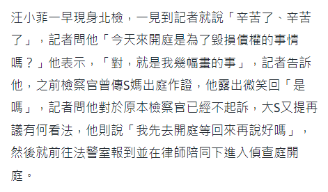 汪小菲以被告身份被传唤出庭讲明,他一早现身地检署,看到记者就说“困难了”,承认是为了毁损债权一案出庭,暗示我方是为了几幅画的事而来。