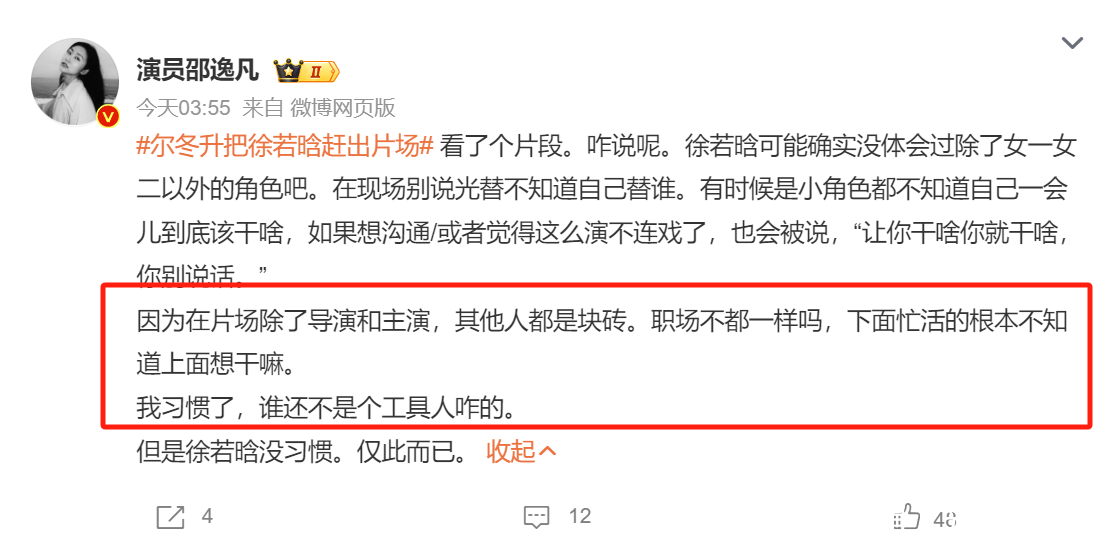 但节目组偏巧就这样安排了,第一次当光替的徐若晗在现场和尔冬升争论起来。本性不是那么好的尔冬升鼓胀不给徐若晗请问和有计划的契机,径直打断她说“你演个光替你莫得权柄去说任何事情,你就站哪里让别东说念主导演去告诉你怎样作念。”徐若晗接过话头,很屈身的示意导演没跟她说(让她怎样作念)。